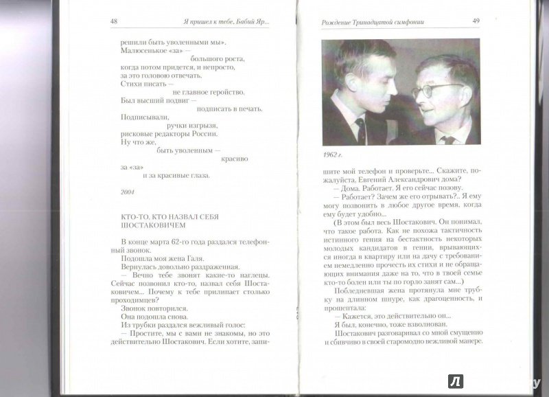 Тринадцатую симфонию Шостакович сочинил на стихи Евтушенко, с помощью музыки он рассказал о трагедии, которая произошла в 1941 году, и создал "первый звучащий памятник Бабьему Яру". В книге Евтушенко поэзия чередуется с воспоминаниями, отрывками из писем, газетных статей, документов - тема Бабьего Яра помещается в широкий культурный контекст. Более того, по прочтении книги становится ясно, что отголоски того страшного события слышны и по сей день.