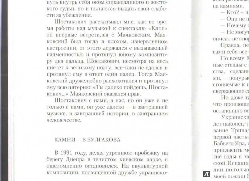 В своей книге Евгений Евтушенко рассказывает об истории создания Тринадцатой симфонии Дмитрия Шостаковича, которая по праву принадлежит к числу великих произведений ХХ века, а также об истории своего стихотворения "Бабий Яр", напечатанного в "Литературной газете" в 1961 году и сразу ставшего событие