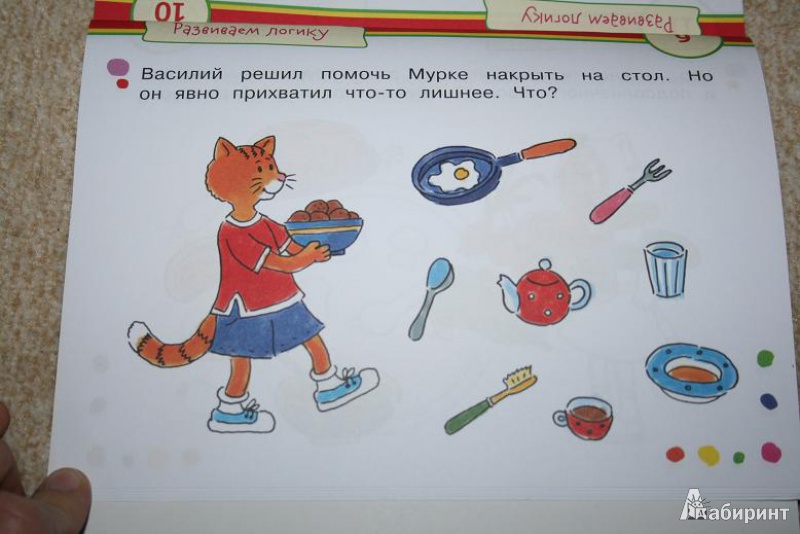 Книга неожиданно маленького формата, удобно брать с собой в машину, например. Здесь собраны разные задания на логику - запомнить список предметов, решить, что можно приготовить из продуктов, найти лишние предметы, выбрать кухонные предметы, посчитать и т.д. Рисунки яркие, хорошие, всего игр 60, хватит не на одну поезд...