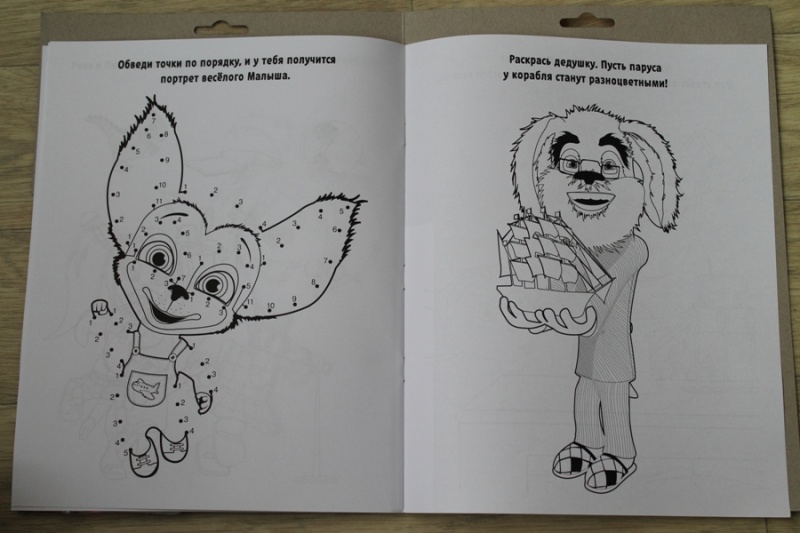 Разочарована покупкой. Картонная обложка с вырубкой, 6 листков с раскрасками и небольшими заданиями, 21 небольшая наклейка, карандашики (два треснуты). Купила бы такое рублей за 50-60, но не за 120.