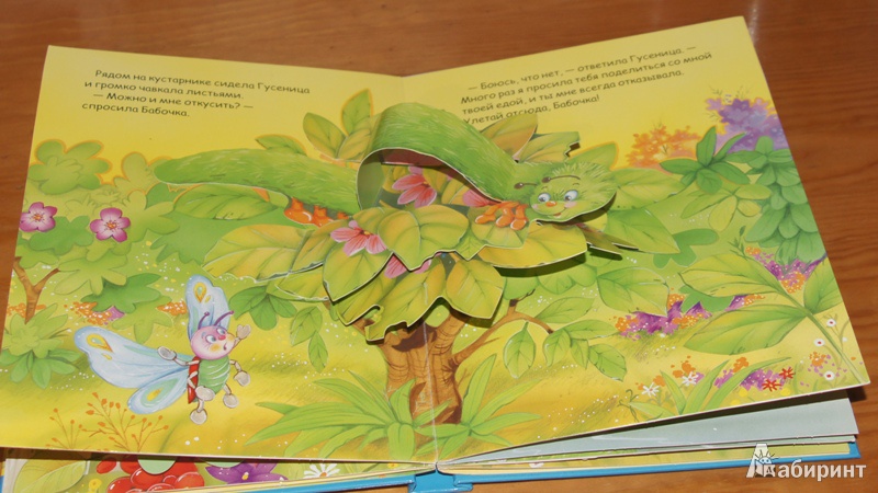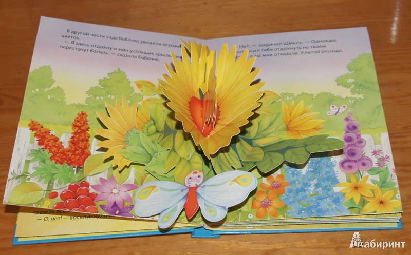 Книжка,как и другие этой серии великолепна.Эта мне нравится даже больше остальных обилием панорамных цветов и растительности.Двигающиеся при открывании 3D картинки, а в панорамке со шмелем есть даже звук,напоминающий его жужжание.На страницах книжки бабочка встретится с божьей коровкой,шмелем,гусеницей,лягушкой,червяч...