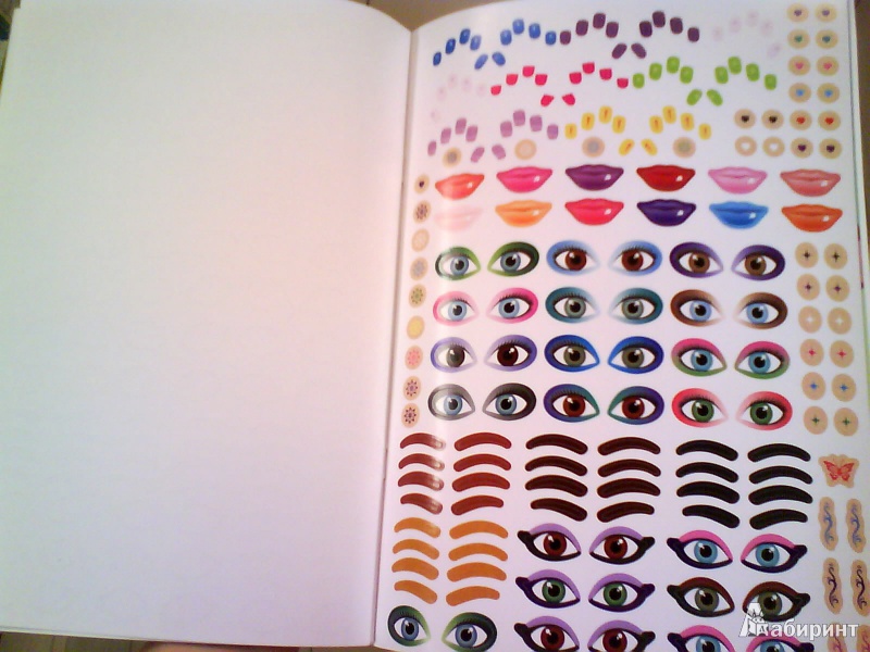 Хорошая книжка для маленьких стилистов. Симпатичные кукольные мордашки, которым нужно придумать подходящий образ. Есть много наклеек. Есть цветные и те, которые самой потом можно разукрасить. На наклейках губки, глазки, красивые бабочки-звездчоки для украшений или тату-макияжа. Я брала всё в двух экземплярах: моей и е...