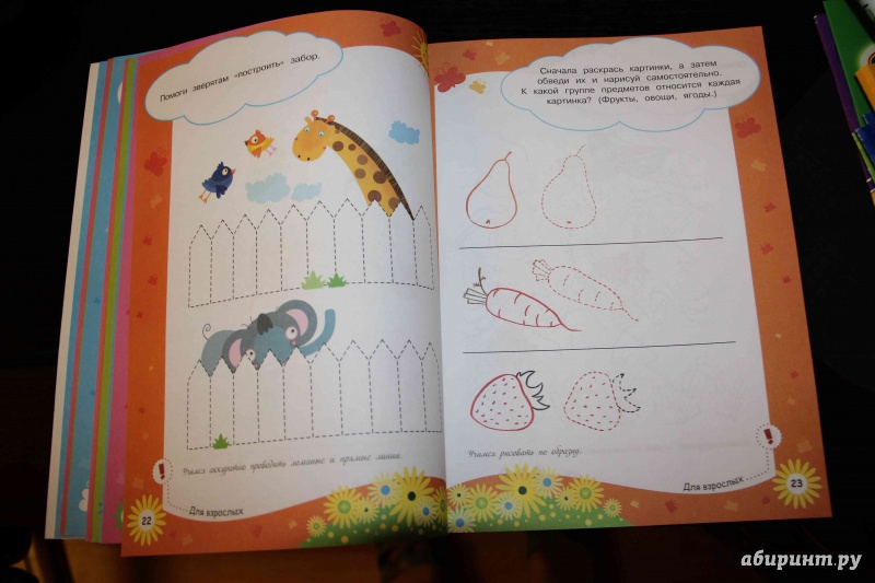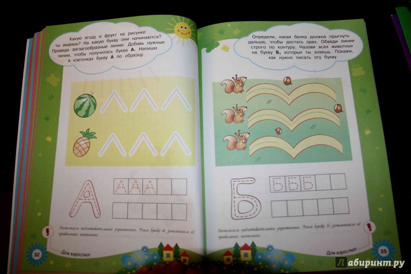 книга толстенькая за счет заданий по тренировке навыка уверенного начертания линий - прямы, косых, кривых. Есть задания по рисованию мелких фигурок в клеточках, что нам пока рано (4 г.), при этом желание писать-чертить буквы есть. Переходим к буквам: понравилось, что есть дополнительные, попутные вопросы-обсуждения - ...