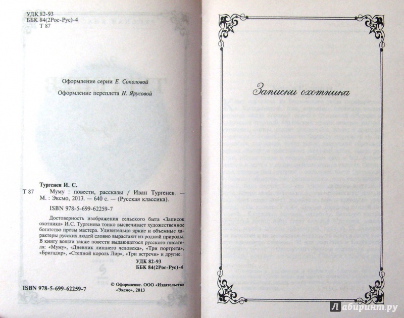 Достоверность изображения сельского быта "Записок охотника" И.С. Тургенева тонко высвечивает художественное богатство прозы мастера. Удивительно яркие и объемные характеры русских людей словно вырастают из родной природы. В книгу вошли также повести выдающего русского писателя: "Муму", "Дневник лишн