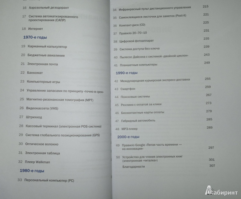 В книге представлены 50 бизнес-идей, которые значительно повлияли на развитие общества. Некоторые из этих идей стали неотъемлемой частью нашей повседневной жизни: персональный компьютер, интернет и спутниковое телевидение. Другие идеи, такие как памперсы или аэрозольный дезодорант, сегодня воспринимаются неоднозначно, но, бесспорно, их отсутствие также сложно представить. Среди перечисленных идей есть и те, которые постепенно отходят на второй план благодаря появлению и развитию цифровых технологий — например, факсимильный аппарат или карманный калькулятор. Но тем не менее их создание на определенном этапе было очень важно.