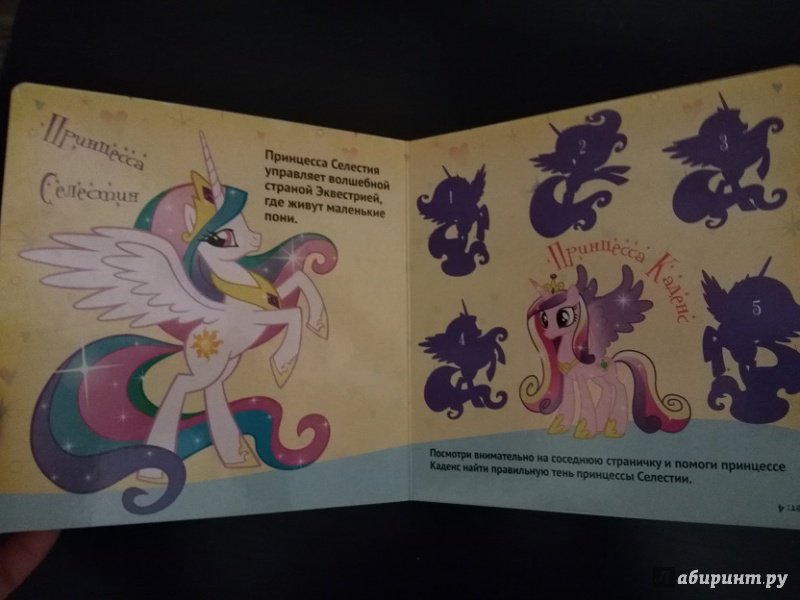 Из всей книги мне понравилась только обложка. На ней есть углубления фольгированные(создается впечатление блёсток). В книге 8 страниц. Полностью из толстого картона. На первом развороте нужно угадать правильную тень принцессы Силестии. На следующем развороте нужно найти зеркальное отражение Спайка и т.д.В нижнем право...