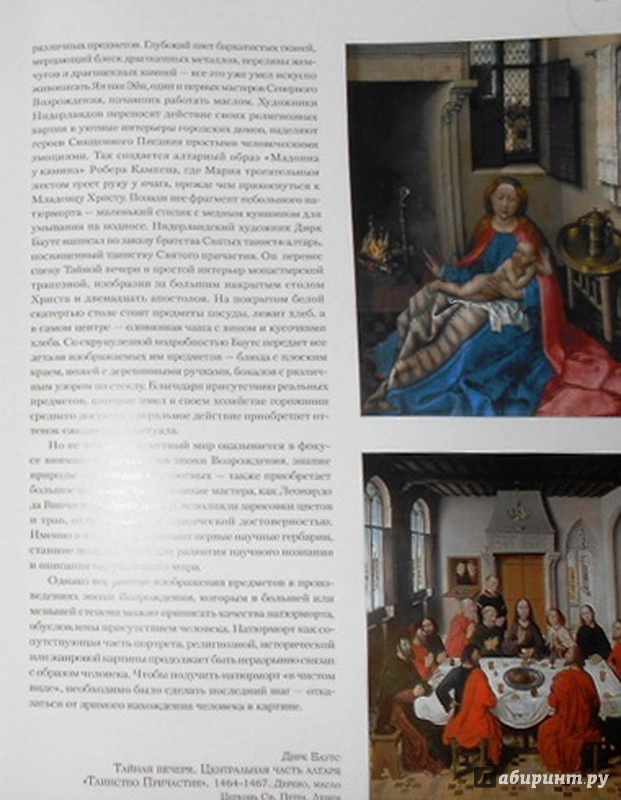 Увеличенный формат, плотная мелованная бумага. Цветопередача хорошая (мои фотографии не передают оригинальное изображение), репродукции замечательные, большое внимание деталям, текс интересный и познавательный. Рекомендую.