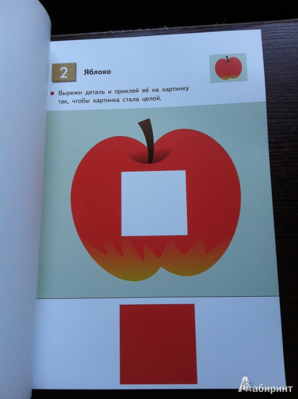 Выполняя задания, ребёнок будет двигаться от простого к сложному. Сначала он будет вырезать одну деталь и приклеивать её на страницу так, чтобы картинка приняла законченный вид. На следующем этапе ребёнок будет учиться вырезать, собирать и приклеивать по образцу сразу несколько разных деталей. Наконец, в последних заданиях ему придётся самостоятельно решать, куда приклеить вырезанные части.