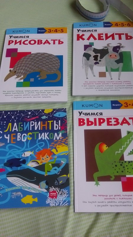 Она учит нас резать бумагу, правильно держать ножницы, пользоваться клеем, и она же подсказала нам как их правильно выбрать. Она - сказка тетрадь от KUMON.
