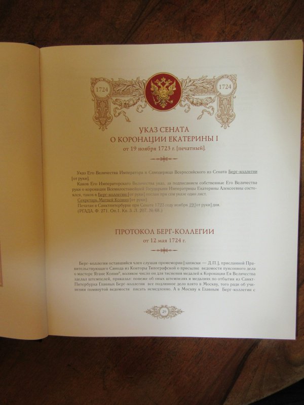 Книга содержит уникальные сведения об учреждении, процессе изготовления коронационных медалей и жетонов, металле, размере, стоимости и количестве изготовленных экземпляров, авторах рисунков и медальерах, лентах, на которых носили медали, представляет списки пожалованных. Также в ней рассказывается об учреждении и изготовлении особой медали "За служение во время коронации", которую жаловали "вместо подарков". Впервые приводятся архивные документы о медальере Рейбише, условиях работы медальеров и оплате их труда; вводятся в научный оборот сведения о коронационных медалях с ушками (для ношения) в правления императриц Елизаветы Петровны и Екатерины II, о существовании которых до настоящего времени не было известно специалистам и экземпляры которых не сохранились даже в музейных собраниях.