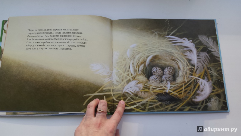 Для малыша 2.8 тяжела для чтения. Не очень поняла на какой возраст. Для более старших мало информации. Сами воробьи красиво прорисованы. Но в целом картинка на страничке не понятная, кусочек вывески, кусочек крыши. Я не сразу поняла что это.