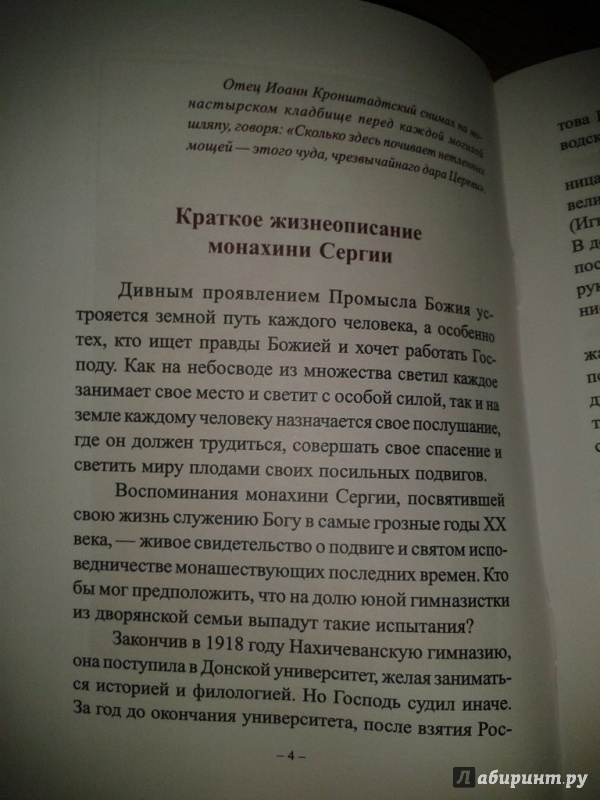 Книга рассказывает о монашеском подвиге монахини Сергии. Тяжёлый жизненный путь, испытания, выпавшие на долю верующего человека. Великая сила веры и сила духа, непрестанная молитва помогают пережить все страдания.