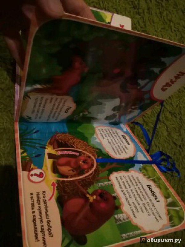 Книгу прочли только один раз, и я ее отложила до лучших времен. Пусть немного детка подрастет, сейчас сложновато что-то разбираться с веревочками и карманчиками. Книжку жалко, на следующий же день полетят клочки по закоулочкам. Книга хорошая, о животных, но пока играть с ней у ребенка не получается.