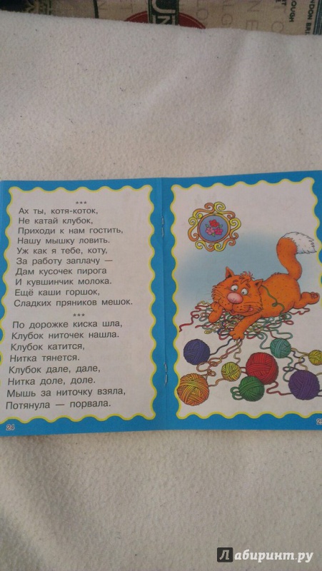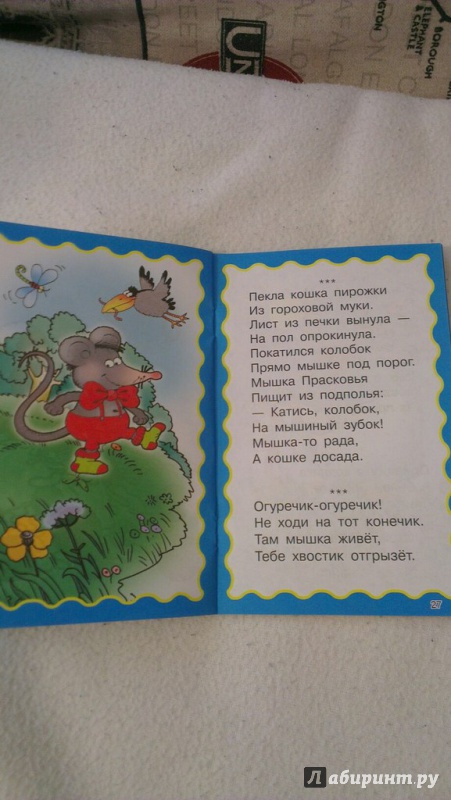 Чудесная книжка с красочными иллюстрациями и стихами- русскими народными потешками, расширяющими словарный запас и кругозор ребенка,только кое-где кое- что сокращено и не заметили ошибку-про гусей и волка:,,щипите на волка,,по-моему, в оригинале и по смыслу:,,щипите вы волка,спасайте гусенка,,Можно еще вариант:,,шипит...