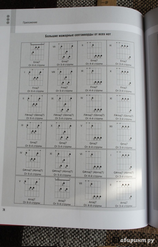 Тоненькая книга увеличенного формата, тонкие белые листы(слегка просвечивают), ч-б печать, много фото-картинок, схем. По названию уже понятно,что главное значение и то есть содержание книги базируется на гитарных аккордах. Разбираются как примеры песен,так и обилие аккордов с самыми невероятнейшими названиями.