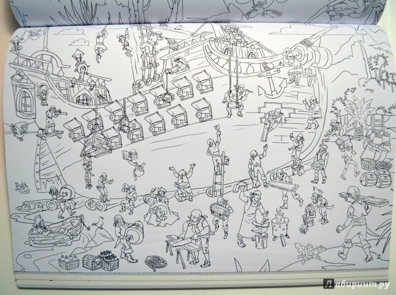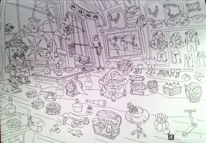 Наклей стикеры по своему усмотрению и воссоздай на панорамках атмосферу пиратских будней! Можешь воспользоваться подсказками в конце книги. С помощью карандашей передай неповторимый колорит пиратской жизни! Ты только что вернулся из морского похода и хочешь, чтобы это приключение на пиратском судне