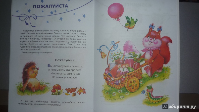 При видимой простоте книжки ваш малыш запомнит "вежливые слова", если вы будете эмоционально участвовать в обсуждении вместе с ребенком и читать ему тексты "живо" и выразительно.
