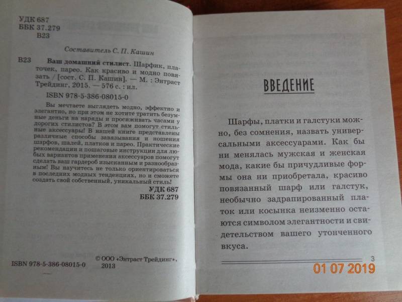 Книга странная, хоть в названии и нет слова галстук, именно ему и посвящена целая половина книги. Про шарфики,платки, парео не очень много да и не очень интересно. Бумага газетная, желтоватая, тонкая. Иллюстрации чёрно-белые, не чёткие - сказывается качество печати. Обложка цветная, но нельзя сказать, что качество пол...