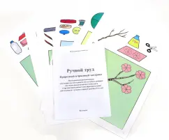 Предлагаемый наглядно-дидактический комплект включает в себя 16 красочно оформленных листов, позволяющих ребенку в совместной деятельности со взрослым или самостоятельной игре осуществить в определенной технологической последовательности, действуя по алгоритму и применяя приемы ручного труда, выполнение 16 моделей из природного и бросового материала (ветка сакуры, парашют, украшения для комнатных цветов, птица, поляна цветов, петушок и др.).