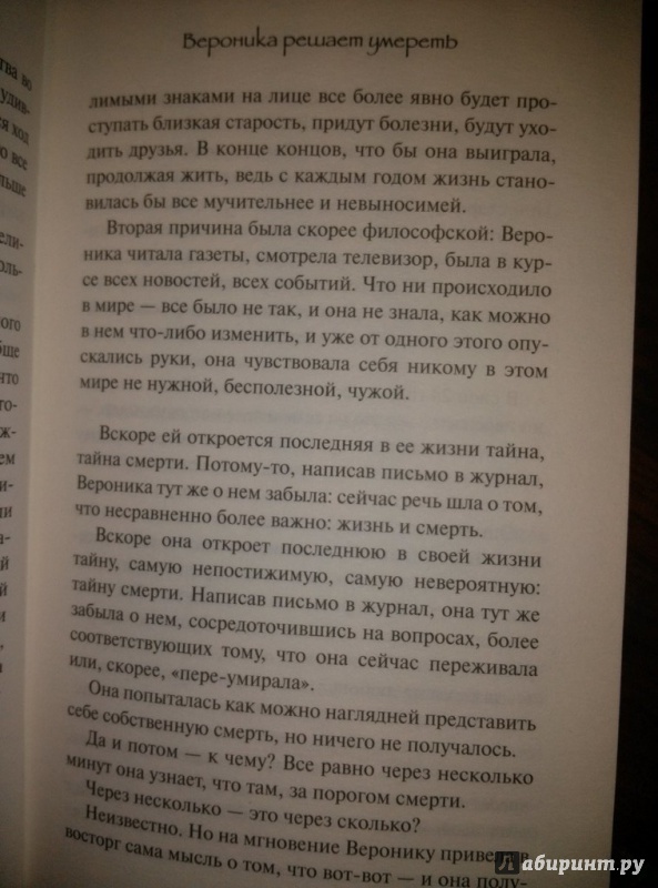 У Вероники есть все: молодость и красота, поклонники и достойная работа. Но в ее жизни чего-то не хватает. И одним ноябрьским утром она решает принять такую дозу снотворного, чтобы никогда больше не проснуться. Вероника приходит в себя в психиатрической клинике…