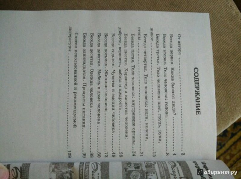 В книге рассказывается о внешнем облике человека, его организме, внутренних органах, органах чувств, характере, жилье, одежде, мебели и продуктах питания. Рассказы сопровождаются стихами, сказками, вопросами и загадками.