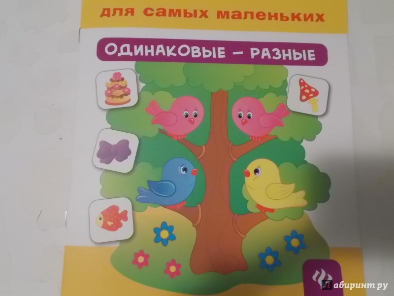 Книжка рекомендована для совместной работы взрослых с детьми дошкольного возраста. Выполняя задания по сюжетным картинкам, ребята знакомятся с понятиями "одинаковый - разный". Лист с наклейками находится в середине. Отделить наклейки с листа самостоятельно у 3-летнего ребенка не получилось, пришлось согнуть ...