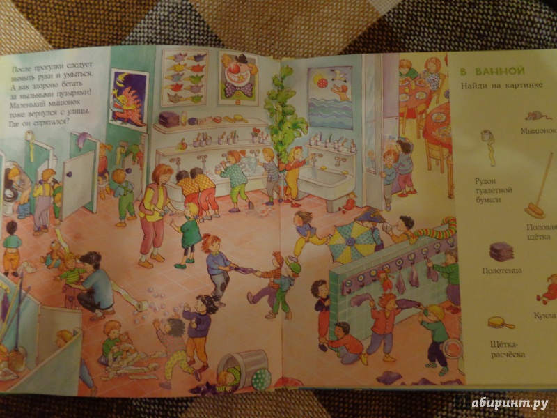 Ты играешь в пряталки в детском саду? Ну конечно, в детском саду много чем можно заняться. Там есть и игровая комната, и спортивный зал, и площадка с горками! Но сегодня вместе с ребятами в детский сад пришёл и маленький мышонок. Он очень хитрый, его нелегко поймать! Рассмотри внимательно картинки. Ты нашёл мышонка? И ещё одно задание: назови все игрушки, с которыми играют дети в этом детском саду.