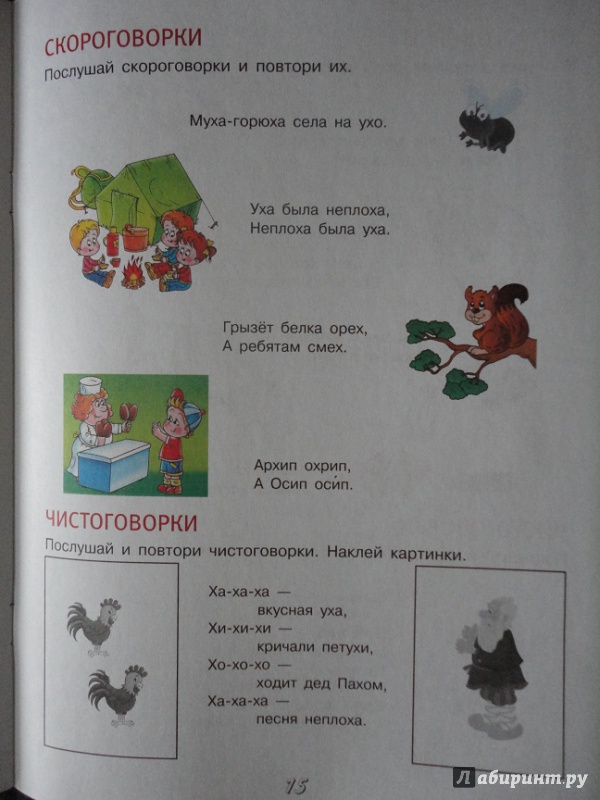 Полагаю было бы лучше иметь картинку и соответствующую ей скороговорку на отдельной странице. Когда куча картин детей отвлекает. Хороший материал, пользуюсь, вот только дети хотят отклеить наклейки.