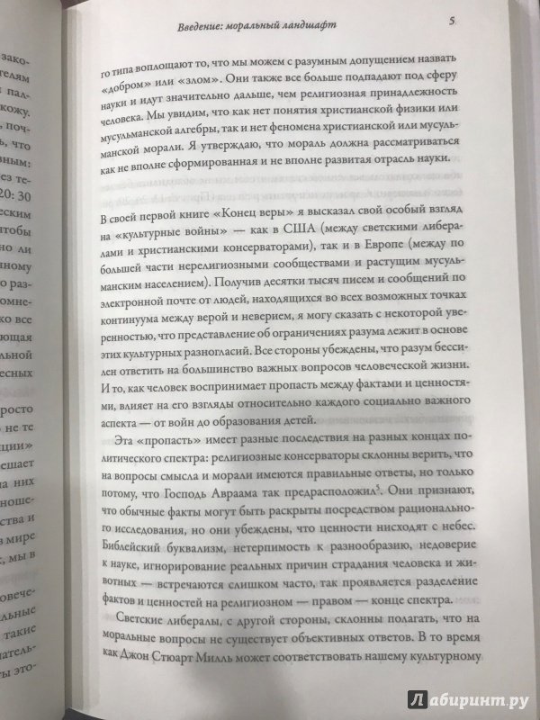 Внеся свежую струю в древнюю дискуссию о добре и зле, хорошем и плохом, Харрис подчеркивает, что мы уже знаем достаточно много о человеческом мозге и его отношении к действительности, чтобы утверждать, что существую правильные и ложные ответы на наиболее острые вопросы человеческой жизни. Поскольку такие ответы существуют, моральный релятивизм просто ошибочен и стоит довольно дорого для человечества. А вмешательство религии в сферу человеческих отношений может быть упразднено. Как нет христианской физики или мусульманской алгебры, нет христианской или мусульманской морали.