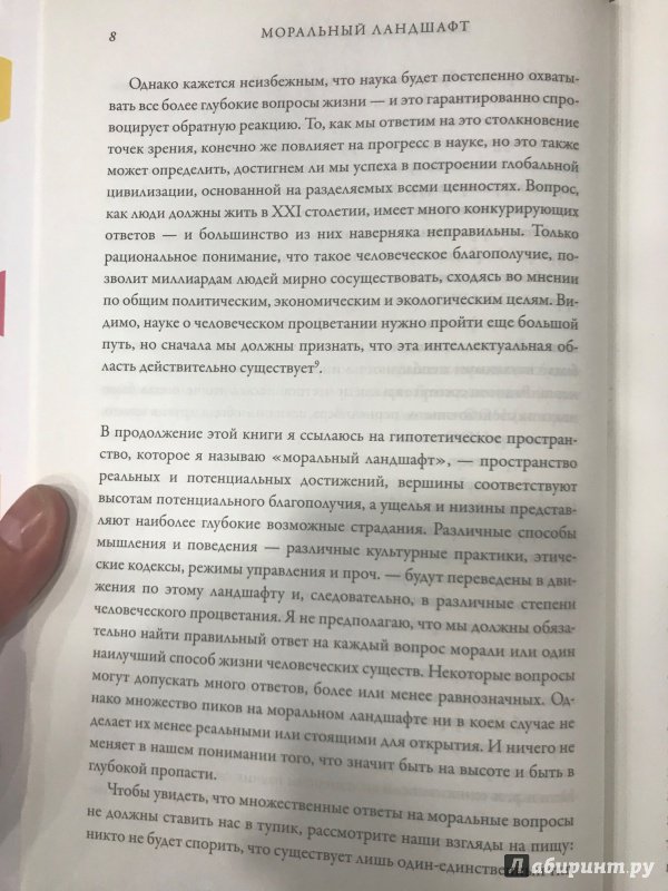 Сэм Харрис разрушает стену между научными фактами и человеческими ценностями, доказывая. что большинство людей ошибочно оценивают отношения между моралью и знанием. Харрис призывает нас думать о морали в терминах благополучия людей и животных, рассматривая человеческий опыт как пики и долины "морального ландшафта". Поскольку существуют известные конкретные факты о том, как мы попадаем в этот ландшафт, Харрис рассматривает время, когда наука не будет ограничивать себя в определении термина "мораль"; в принципе, наука должна быть способна сказать нам о том, что значит жить максимально правильной жизнью.