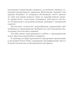 В пособии представлены страноведческие тексты, построенные как рассказы о судьбах замечательных русских женщин - наиболее ярких представительницах русской культуры, в жизни которых отразилась историческая эпоха. Авторы в целях расширения страноведческих знаний учащихся наряду с широко известными персоналиями русской культуры предлагают сведения о тех, кто менее известен иностранной аудитории. Материал распределен по разделам, соответственно тому, в каких жизненных сферах реализовывали себя женщины, биографии которых представлены в данном пособии. К каждому тексту подобран комплекс лексико-грамматических упражнений, цель которых - снятие лексических трудностей, расширение активного лексикона и развитие грамматических навыков учащихся.