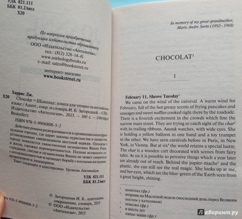 Книга очень красивая, несмотря на то,что не в твердой обложке, серия бестселлеры. Текст адаптирован для изучающих английский язык. Кому просто хочется прочесть знаменитый Шоколад на английском, советую купить оригинал, иначе полной картины о произведении вам не сложить, повторюсь, текст книги упрощен и сокращен, в кон...