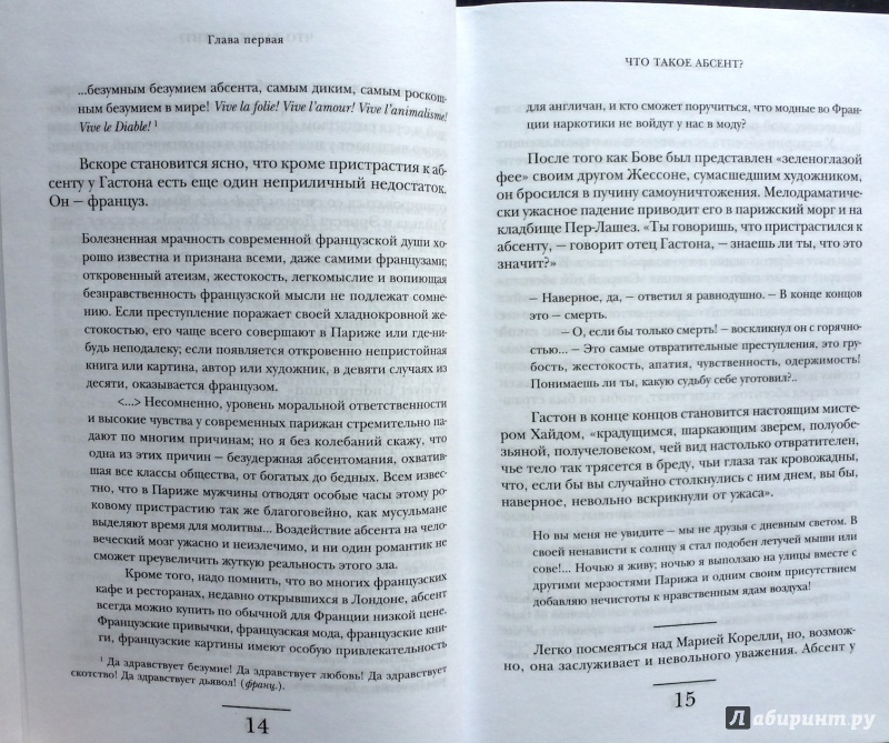 Книга гораздо лучше, чем предполагала. Рекомендуется только для образованного читателя, т.к. насквозь пропитана отсылками, именами, цитатами и историческими событиями. Очень интересно и легко читается, даже если абсент не объект вашего поклонения.