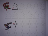 А нам понравилась пропись. всё понятно по стрелочкам куда что обводить. Если приглядеться, то видно, что герои тематически связаны с фигуркой для обводки. на первой странице самые простые фигуры (квадрат, треугольник и ромб, не хватает круга, конечно) далее посложнее. Для отработки каждой фигурки даны две строчки