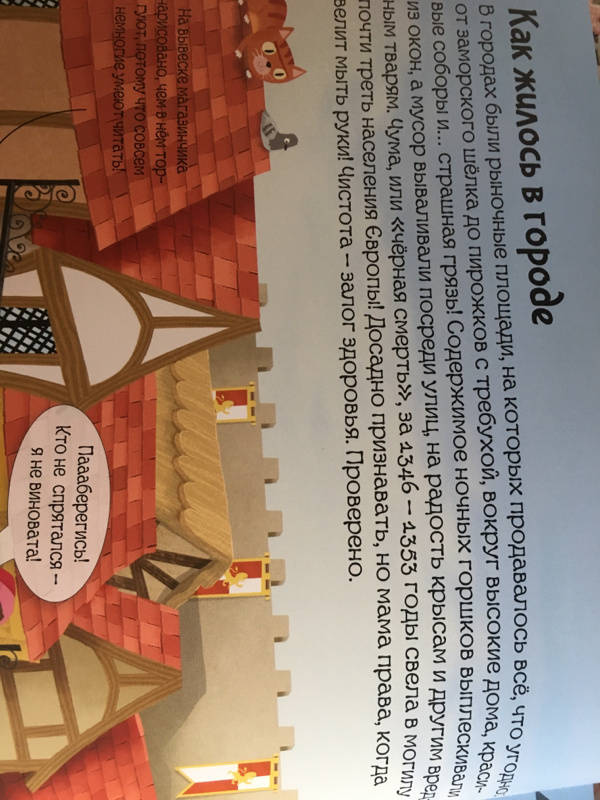 Наша любимая серия книжек, все интересно и увлекательно, но именно в этой книге меня смутили некоторые картинки. Например, убитые рыцари около крепости, которые пронизаны стрелами и лежат в крови! А также кишки животных на странице про жизнь в городе. Хорошо, что хоть казнь не нарисовали)) По-моему, это явный перебор,...