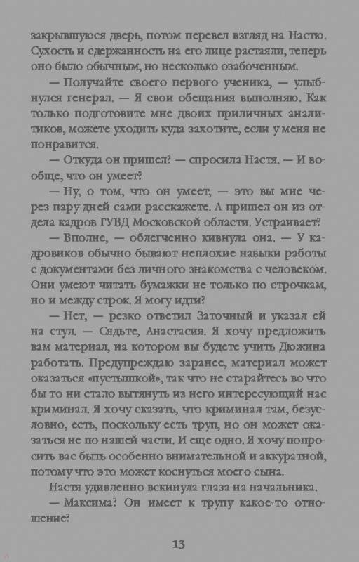 Александра Маринина пишет довольно таки сложные и интригующие детективы, с крепкой сюжетной линией, хитросплетениями, рассуждениями, умозаключениями и своей позицией на жизнь и время. Все это она передает через свою главную героиню Анастасию Каменскую.