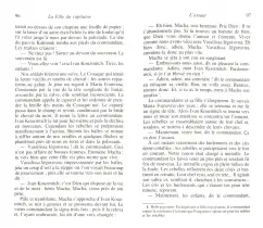 A l'age de seize ans, sur ordre de son pere, Piotr Andreitch Griniov gagne le fort de Belogorsk ou il va servir et, parce qu'il est noble, devenir d'emblee officier. Quoique la vie de garnison ne fut pas faite pour le seduire, son existence devient vite plaisante, en particulier grace a la presence de Maria Ivanovna, la fille du capitaine, qu'il souhaiterait epouser. Mais, au debut d'octobre 1773, on apprend que le cosaque Pougatchov vient de reunir une bande de brigands et se fait passer pour Pierre III, le defunt epoux de Catherine II: il ne va pas tarder, a prendre le fort d'assaut et ce sera, pour Griniov, l'occasion de montrer qu'il est bien le "chevalier" de Macha. La rebellion de Pougatchov a reellement eu lieu et Pouchkine lui a consacre un livre d'histoire avant de faire paraitre en 1836, quelques semaines avant sa mort, La Fille du capitaine. Mais, dans ce roman historique, c'est a Griniov qu'il laisse le soin de raconter a la premiere personne les menees de ce Pougatchov qu'il affronte et qui, sous ses yeux, sous les notres, entre deux moments de ferocite, se montre aussi capable d'humanite: fascine par l'abime, le brigand devient fascinant.