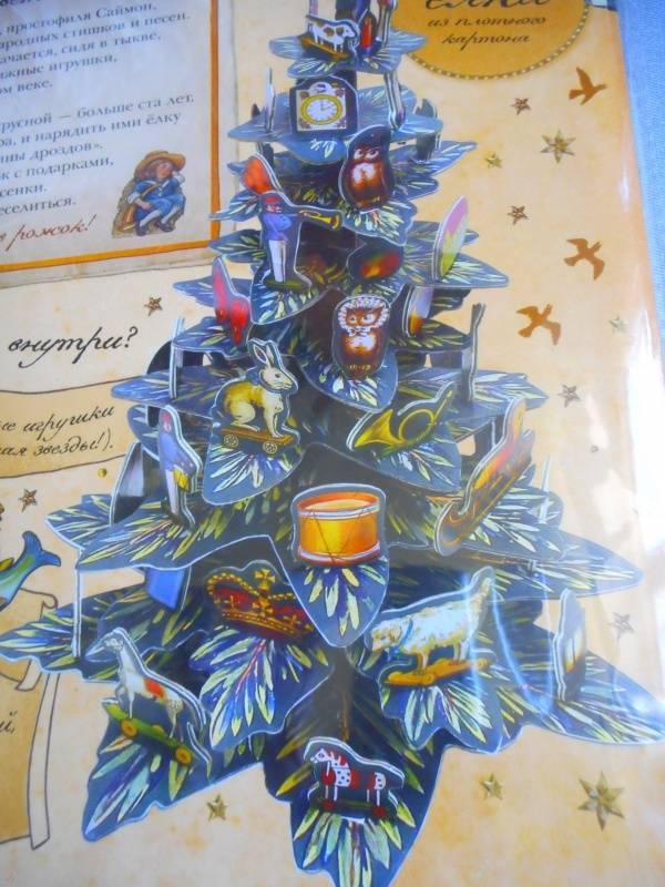 7 листов картона разной плотности с моделью елки, игрушками, качалками, картами. Книга с фигурной вырубкой, 20 с.