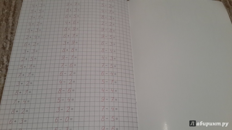 В прописе 16 страниц, на каждой странице отрабатывается определенная цифра, вплоть до 20. На 16 странице есть легкие примеры. Хорошая пропись.