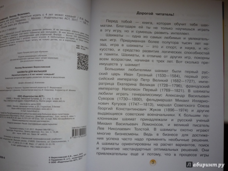 Я тщательно выбирала книгу, чтобы научить маленького сына (4 года) играть в шахматы. Книга очень понравилась, все правила рассказаны в игровой форме с участием Клоуна и мальчика, которого он обучает, а заодно и мы обучаемся. Доступно и просто, сын быстро освоил все фигуры, на усвоение материала с практикой для одной ф...