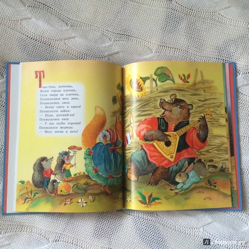 Книга замечательная! Обложка, бумага, качество печати - все на высоте! Из минусов пожалуй только то, что разворотные иллюстрации плохо продуманы художником. Например у лисы мордочка попадает на линию разворота, смотрится не очень.... Но все равно рекомендую к покупке. Потешки любимые, иллюстрации с душой.