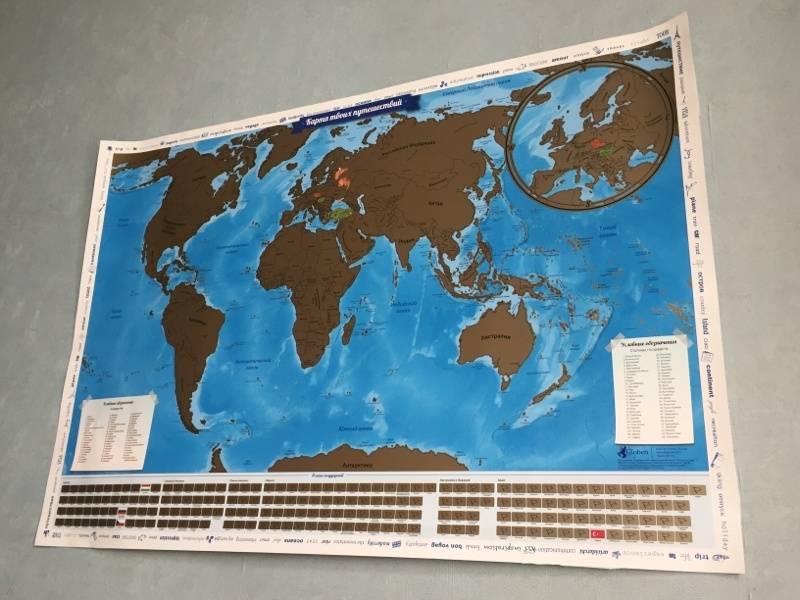 прекрасный подарок себе. Эта карта у меня на работе. жалко регионы России не отмечены. а так активно пытаюсь открыть все больше стран. плотная бумага, яркие цвета и большой размер очень радует