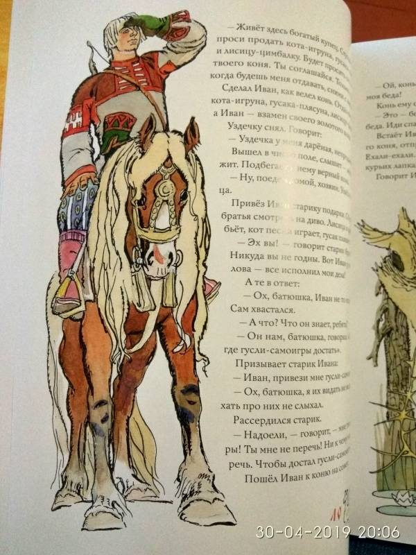 Это одна из лучших книг со сказками в нашей библиотеке! Иллюстрации превосходны! Всадник на обложке как живой - ребёнок в восторге! Возникла масса вопросов и интереса - что за Баба Яга, что за нечисть, кто такой дьяк, кто такой кум... Волки, как живые! А кто в лодке плывёт? А! Это не лодка, а ладья?? А царь в какой т...