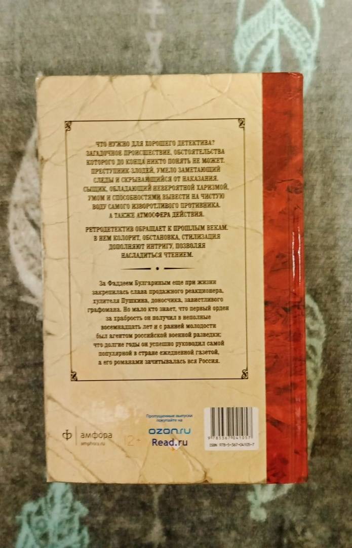 Это нечто странное. Приобретая книгу из серии "ретро детектив" ожидала прочитать детектив. Сейчас, по прочтении 1/4 книги не дождалась и намека на детектив. Книга состоит из коротких рассказов из жизни Булгарина. Много описаний военных сражений. Получила не то, на что рассчитывала. Вряд ли смогу дочитать до ...