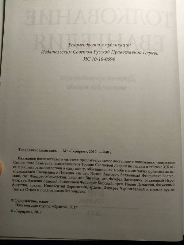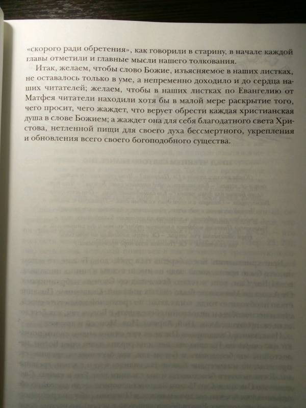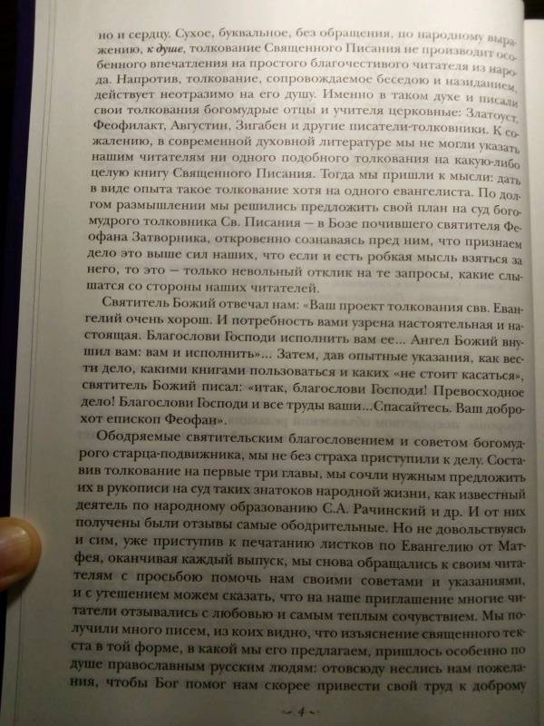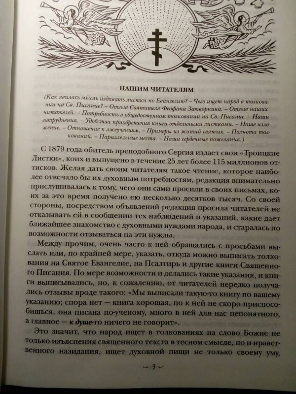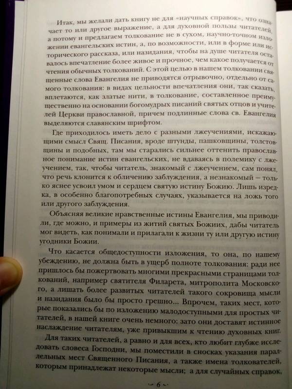 В общем понравилась, плюсы что текст Евангелия выделен жирным шрифтом и что самое ценное для меня он на церковнославянском. В других изданиях текст Евангелия на русском. Тут еще есть примечания, но они в конце книги, и в принципе можно без них обойтись, там в основном ссылки на другие места из Библии и чьи были мысли ...
