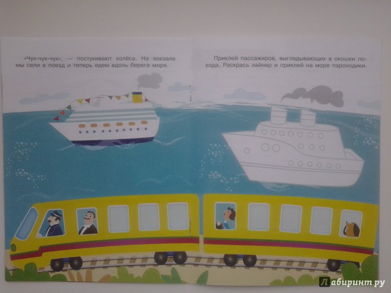 Покупала эту книжку в дорогу ребенку 1,7 года. Книжка ему понравилась. Картинки красивые, цвета меру яркие. Рассматривали с ним транспорт, озвучивали. Наклейки ребенок клеил сам с моей подсказкой. Удобный формат под детскую ладошку7