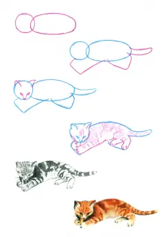 Замечательное пособие для рисования кошек. По шаговые рисунки кошек разных пород и расцветок, в разных позах. Формат А4, бумага плотная.