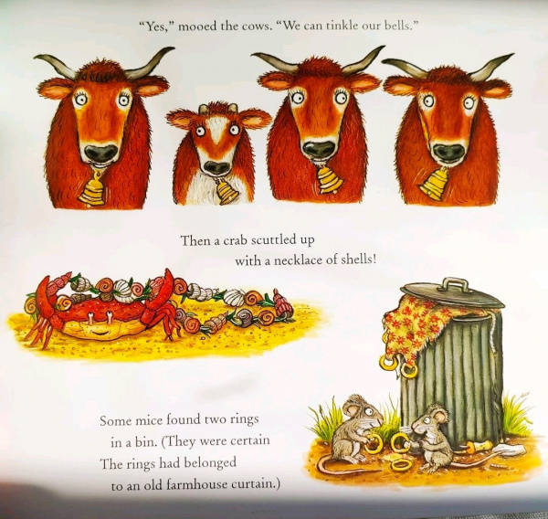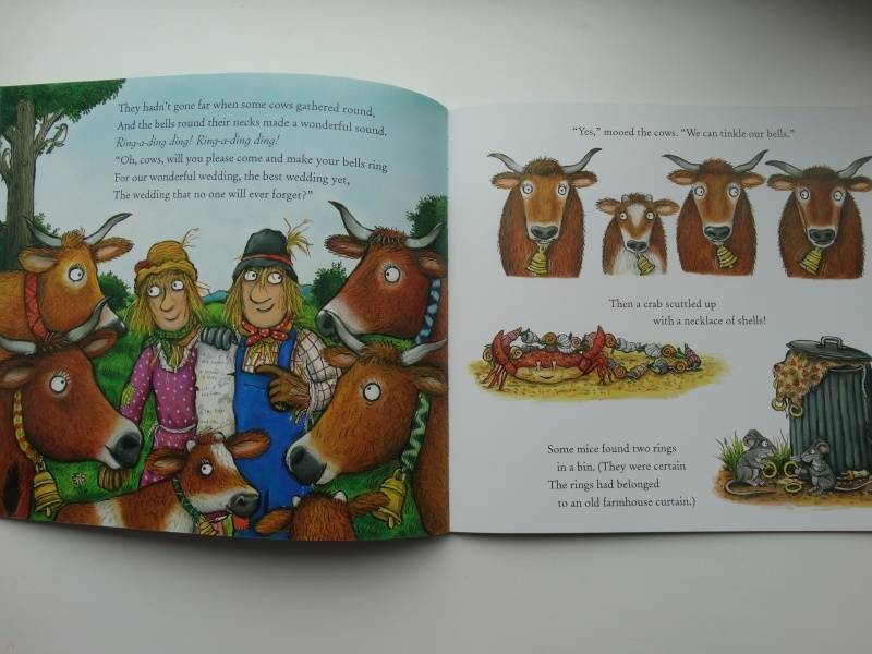 Замечательная книга от известных создателей - писательницы Джулии Дональдсон и художника Акселя Шефлера. Книга большого формата, всего 32 страницы, бумага мелованная, обложка из тонкого ламинированного картона с тиснением золотом. Забавная история про свадьбу в стихах придётся по душе маленьким читателям и их родителя...