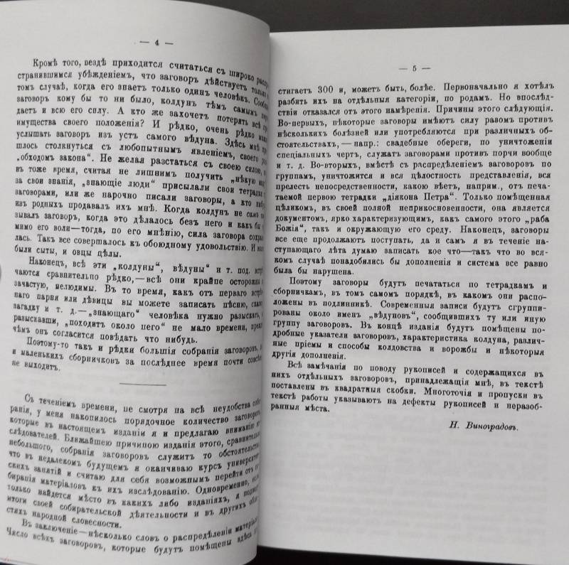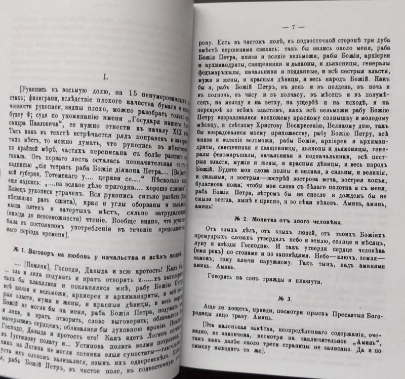 Репринт с издания. СПб, 1907, 1908, 1910. Три выпуска в одном переплете. Содержит большое количество записанных известным русским историком и собирателем древних рукописей старинных заговорных текстов, апокрифических христианских молитв, описаний первоисточников текстов.