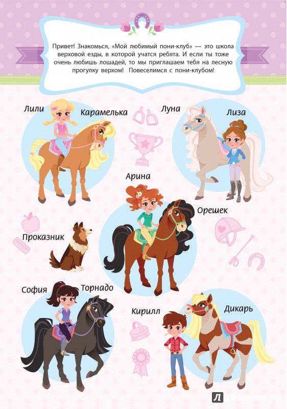 Любите ли вы лошадок так, как любим их мы? Тогда давайте же отправимся в школу верховой езды "Мой любимый пони-клуб", где мы сможем посетить тренировки, покормить лошадок, поучаствовать в соревнованиях и проверить себя на знание основ верховой езды. В каждой книге вы найдете 100 наклеек, игры и раскраски с очаровательными лошадками.